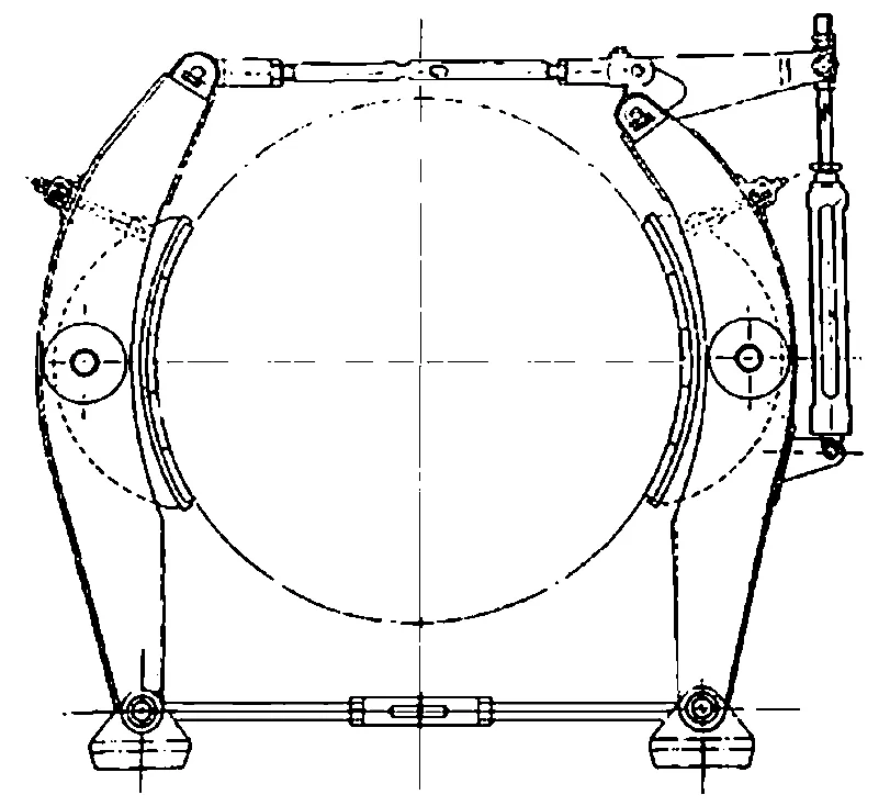 (3)綜合閘 早期國(guó)產(chǎn)的 JKA 型提升機(jī),舊角移式閘瓦存在磨損不均問題,其制動(dòng)系統(tǒng)的改造采用綜合閘(見圖 1),以減少閘瓦磨損,延長(zhǎng)閘瓦使用壽命。