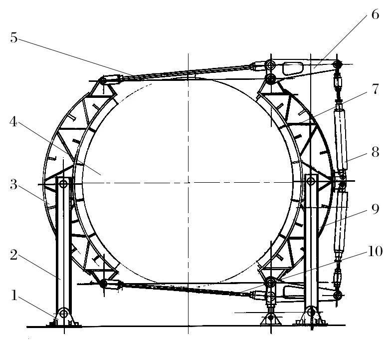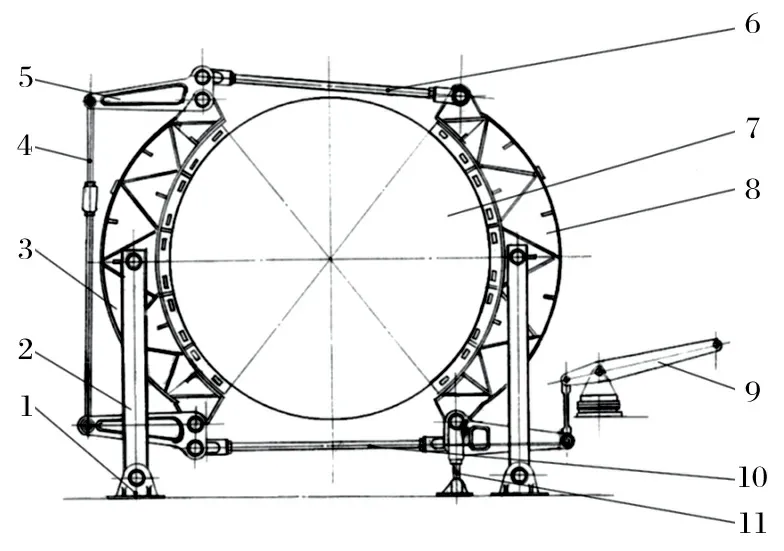 (6)方案簡單 對于滾筒直徑大于4 m 的舊式提升機(jī),推 薦采用氣壓-重錘平移式制動(dòng)器。該改造方案不僅保留了滾筒制動(dòng)輪構(gòu)件、基礎(chǔ)、前后制動(dòng)梁,還保留了三角杠桿和頂部拉桿,方案更為簡單。以 HKMZ 型提升機(jī)為例,改造前后分別如圖4、5 所示。對比兩圖可知,改造量更少,因而成本更低,且造型美觀,達(dá)到了預(yù)期的效果。