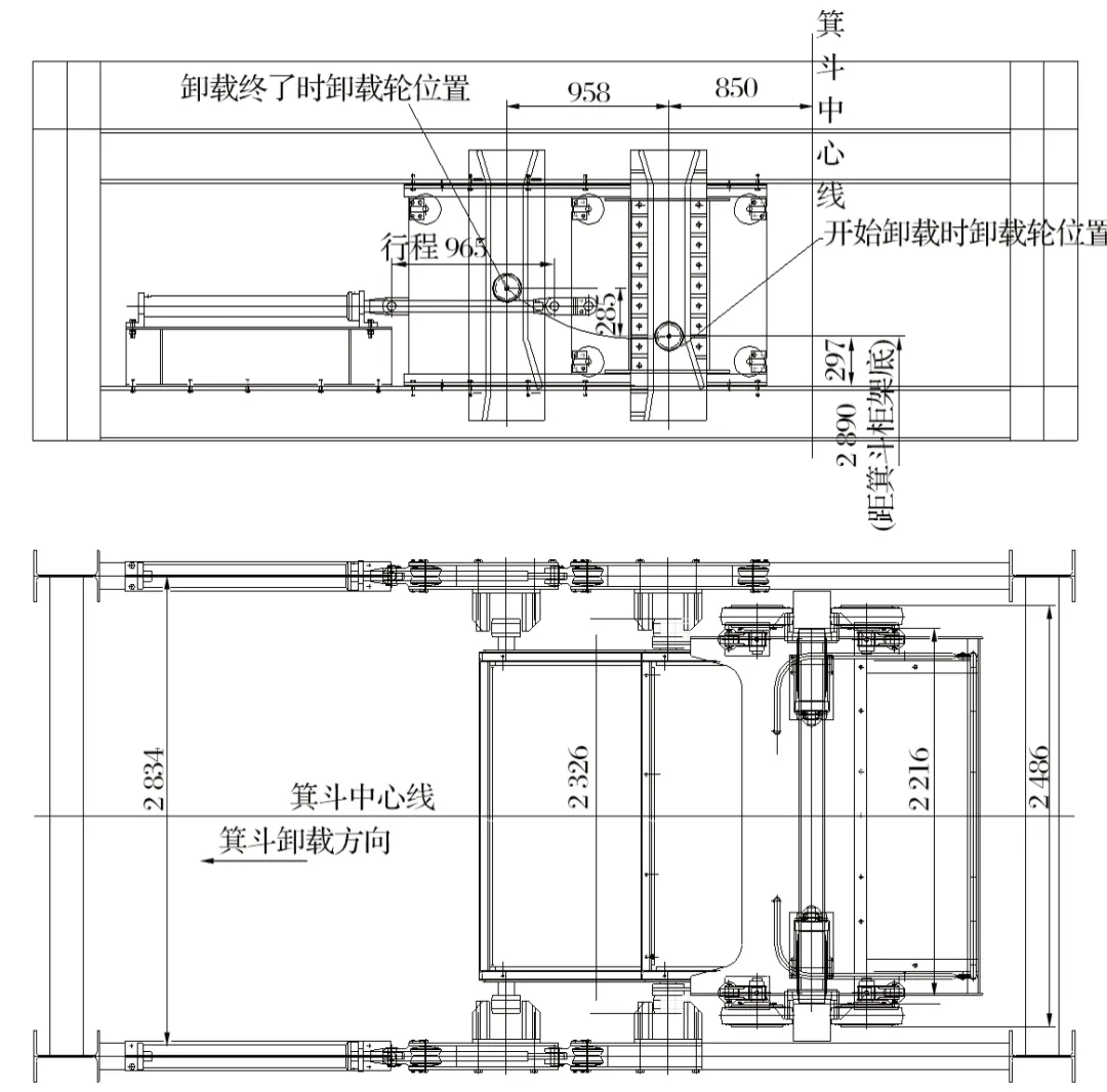 (2)這種2個(gè)卸礦點(diǎn)應(yīng)用在同一箕斗的卸礦方式在我國尚屬shou 次,會澤礦3號豎井是目前wei 一在用的雙卸載點(diǎn)礦井。一般的礦井一個(gè)井筒采用一個(gè)卸礦點(diǎn),多個(gè)水平的多點(diǎn)卸礦一般要打多個(gè)井筒。為了多點(diǎn)卸礦功能的順利實(shí)現(xiàn),移動直軌到位精度偏差不能超過±5 mm,并且應(yīng)滿足鋼絲繩正常的彈性變形伸縮量的卸載要求。多點(diǎn)卸礦為礦山開采節(jié)約了大量成本,移動直軌卸載裝置如圖2所示。