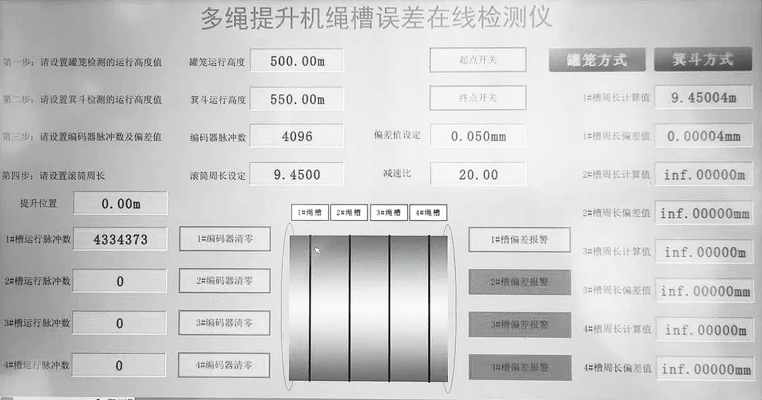 繩槽誤差在線檢測報警裝置的功能:①旋轉編碼器測量卷筒的周長,將繩槽直徑放大 3.14 倍,如果運行 50 圈,相當于放大了 157 倍,準確性高,存儲系統(tǒng)對測距數(shù)值進行存儲;②PLC 記數(shù)運算裝置具有比較功能,繩槽誤差超過要求時,顯示器上會出現(xiàn)報警畫面,及時提醒提升機管理員進行調繩,避免出現(xiàn)提升事故;③其余數(shù)據(jù)信息通過顯示器進行動態(tài)顯示,可以直觀了解每根鋼絲繩的運行速度,每個繩槽的直徑誤差,易于發(fā)現(xiàn)繩槽磨損規(guī)律,提高檢查及檢修的工作效率。繩槽誤差監(jiān)控應用如圖1 所示,繩槽誤差監(jiān)控軟件報警界面如圖2 所示,提升機卷筒直徑計算界面如圖3 所示。